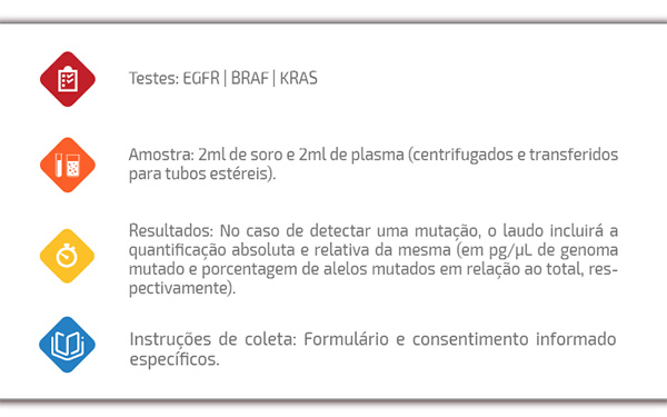 Atualmente, encontram-se três tipos de testes disponíveis, EGFR, KRAS e BRAF:
