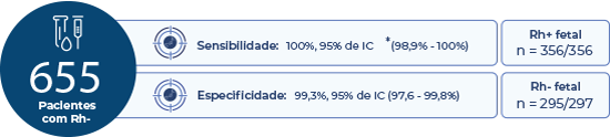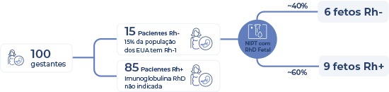 | O uso do NIPT para priorizar o uso de RhIg e conservar o fornecimento de RhIg é uma consideraçãorazoável no ambiente profissional que está enfrentando escassez de RhIg. A genotipagem não invasiva do antígeno dos glóbulos vermelhos fetais utilizando DNA livre de células (cfDNA) isolado do plasma materno demonstrou alta sensibilidade e especificidade para detecção do status do antígeno Rh(D) fetal.” - ACOG Rho(D) Immune Globulin Shortages Practice Advisory, atualizado em abril de 2024 Até 40% das gestantes com Rh D-negativo carregarão um feto Rh D-negativo. Nesta situação clínica, a administração pré-natal de imunoglobulina anti-D é desnecessária.” - ACOG Practice Bulletin 181: Prevenção da aloimunização de Rh D. |