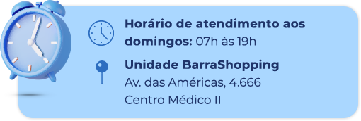 Pensando em trazer mais comodidade e flexibilidade para o seu cuidado, a unidade BarraShopping, no Centro Médico II, possui horário estendido aos domingos. Assim, você e sua família podem realizar seus exames com mais tranquilidade, sem impactar na rotina.
