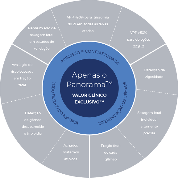 Em um estudo de desfechos de um milhão de pacientes, o PanoramaTM demonstrou >90% VPP para trissomia 21 em todas as mulheres, incluindo aquelas com menos de 35 anos.14 |